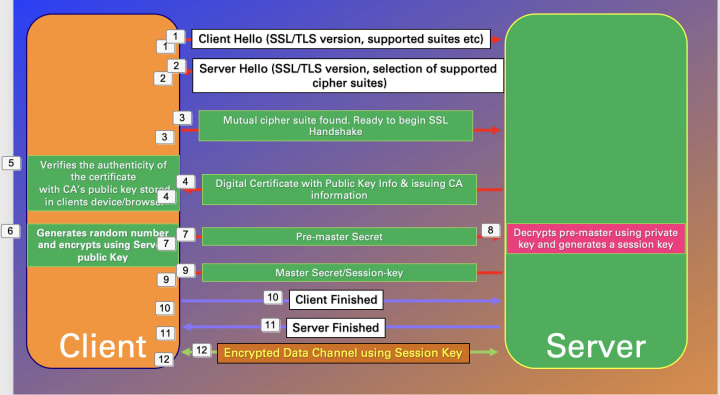 1. The client sends a "Client Hello" message to the server, which includes information about the client's SSL TLS version and a list of supported cipher suites, indicating the encryption and authentication methods.