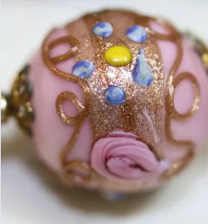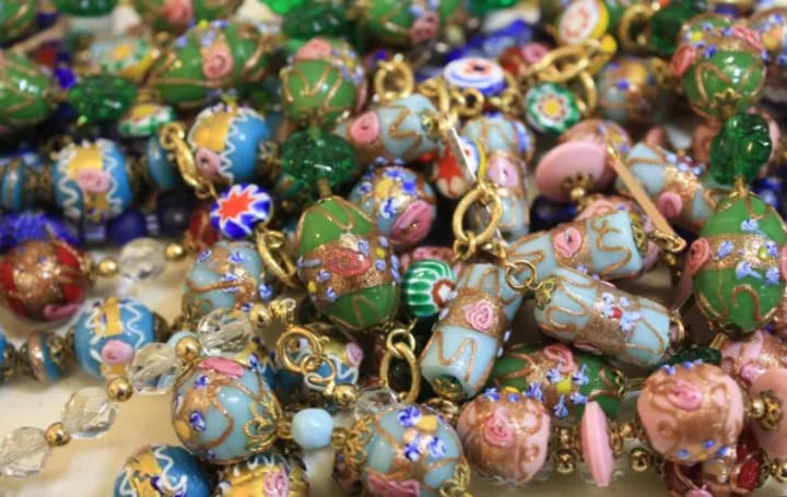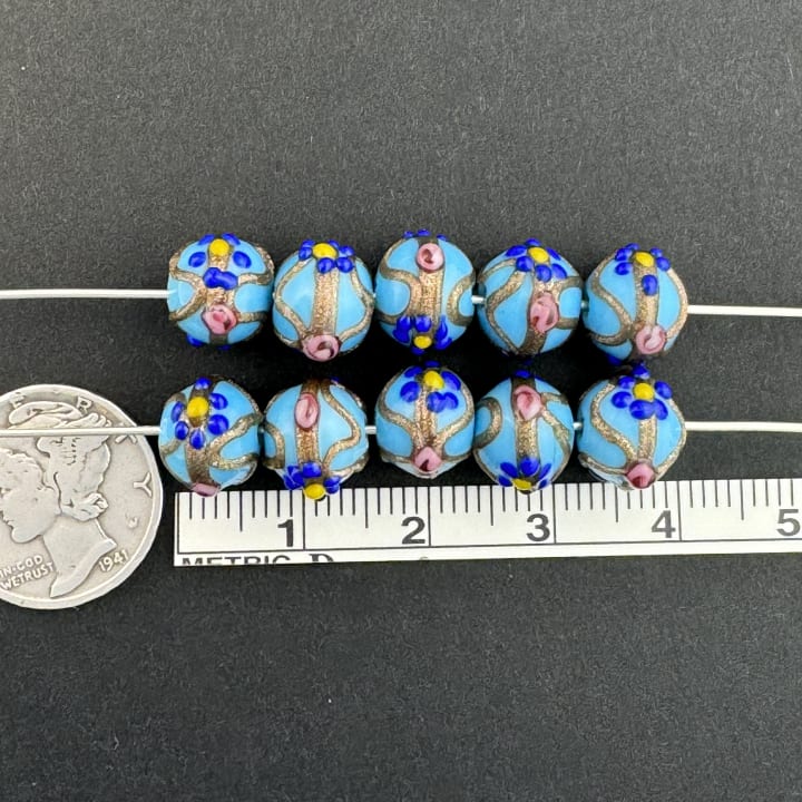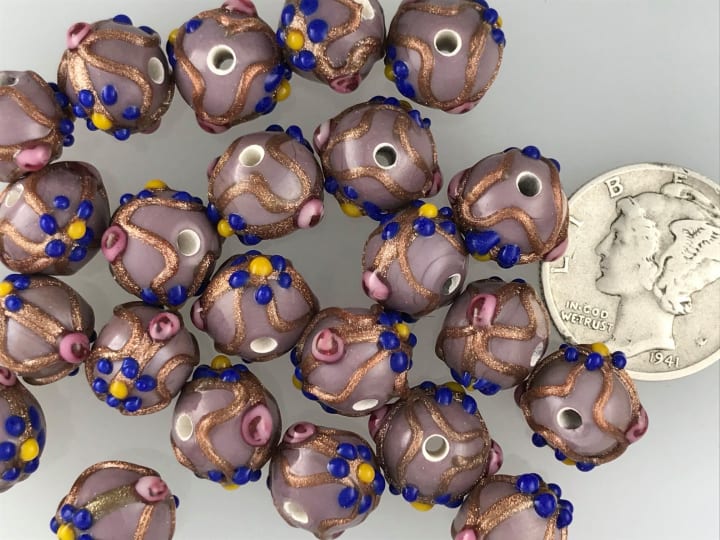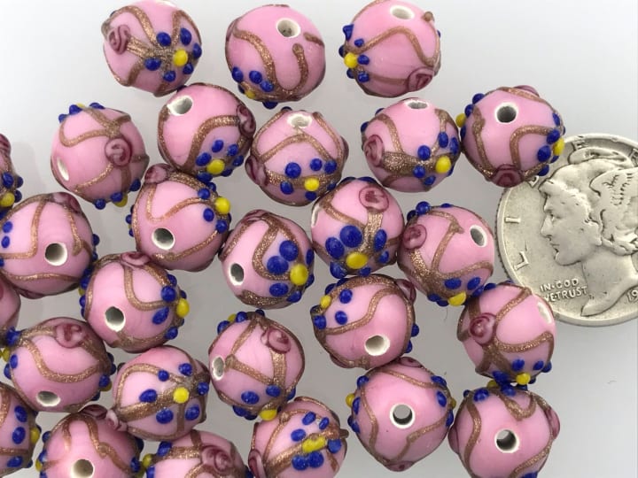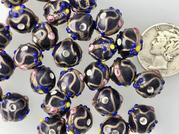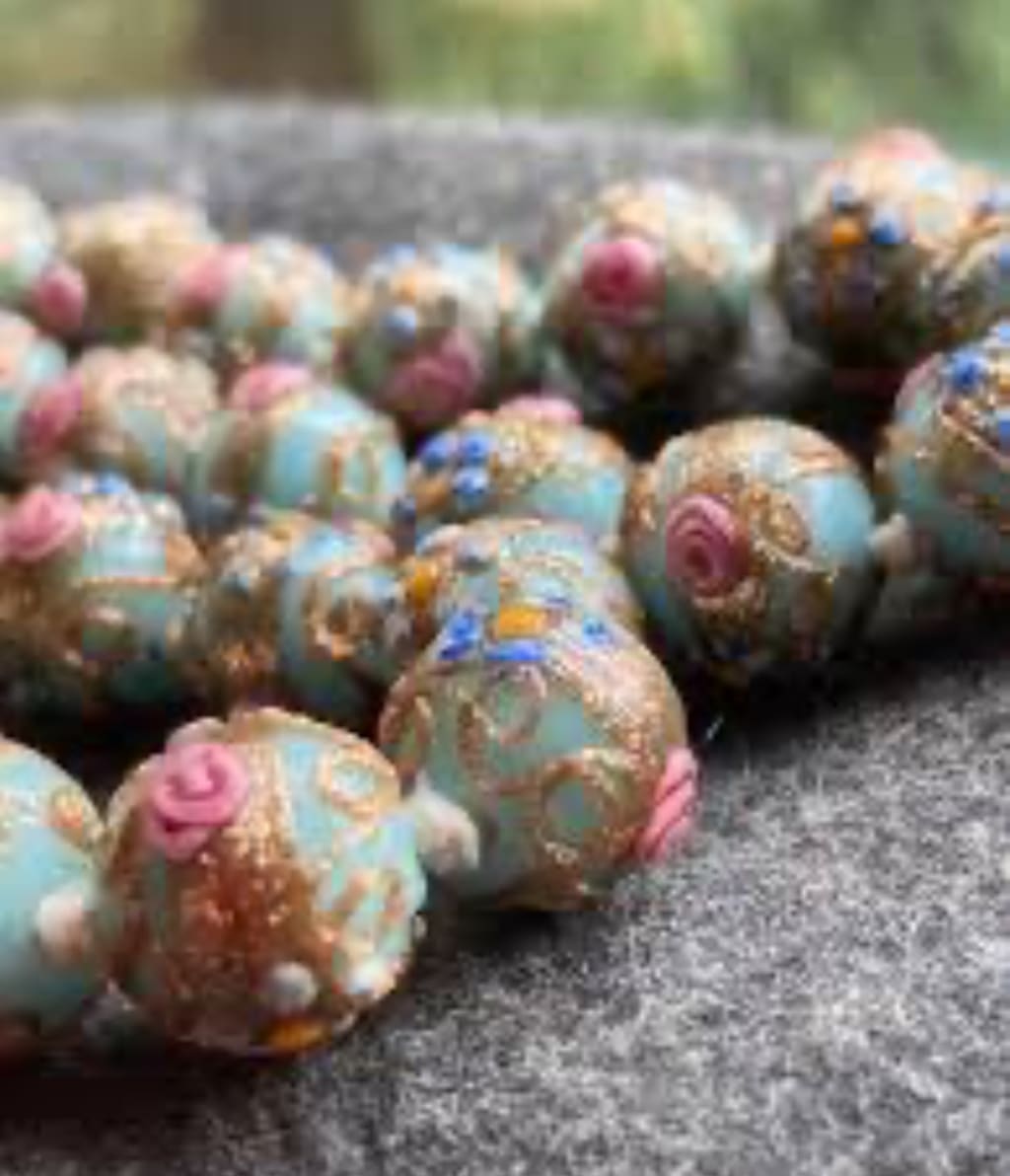 Wedding cake beads (or fiorato beads) are ornate, lampworked Venetian glass beads originating from Murano, Italy, with roots tracing back to the early 19th century and peaking in popularity during the 1920s–1950s. They feature raised, flower-like glass decorations, aventurine, and gold/silver foil that resemble cake frosting.