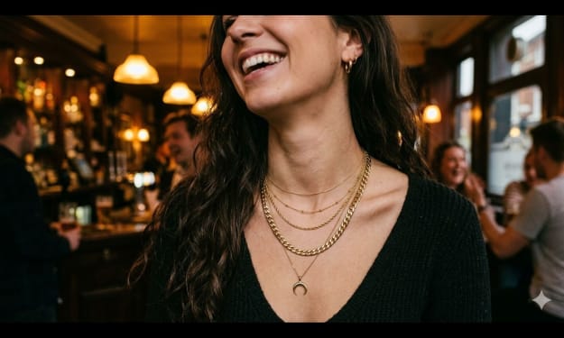 She stood at the bar in a south London pub on a Friday evening, her collarbone stacked with five chains of varying lengths, each one catching the light differently as she laughed. One was delicate, barely visible. One was thick and flat, sitting heavy against her chest. Another carried a small pendant, a tiny crescent moon, swinging gently with every movement.