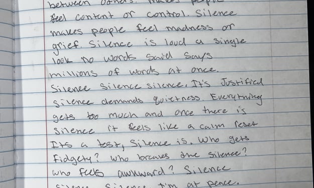 Silence silence silence. What some people think of it differs between others. Makes people feel content or in control. Silence makes people feel madness or grief. Silence is loud a single look no words says millions of words at once. Silence silence silence it’s justified. Silence demands quietness. Everything gets too much and once there is silence it feels like a calm reset. It’s a test silence is. Who gets fidgety? Who breaks the silence? Who feels awkward? Silence silence silence I’m at peace.