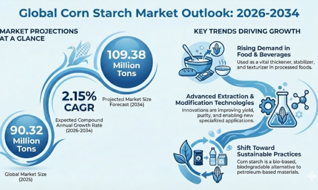 According to IMARC Group's latest research publication, global corn starch market size reached 90.32 Million Tons in 2025. Looking forward, IMARC Group expects the market to reach 109.38 Million Tons by 2034, exhibiting a growth rate (CAGR) of 2.15% during 2026-2034.