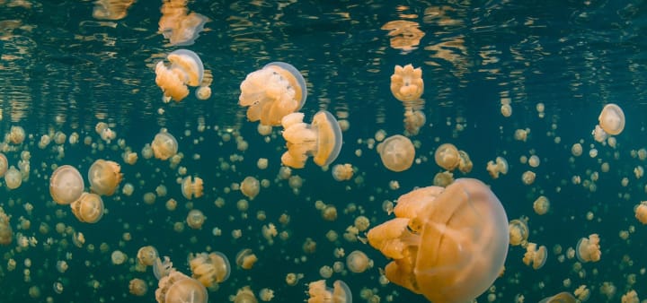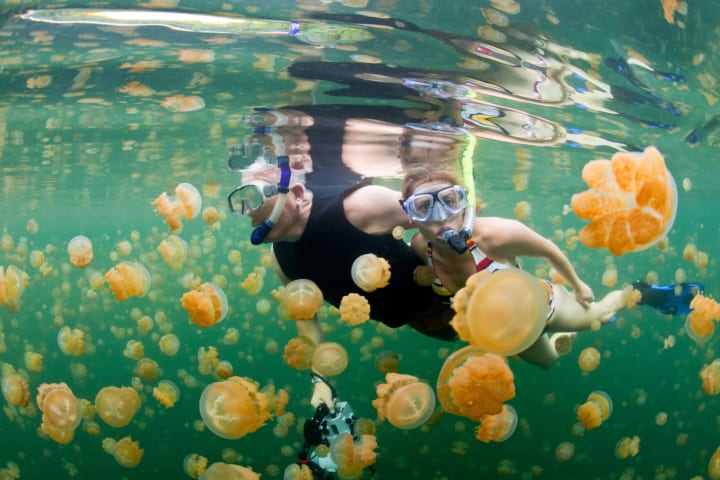 Palau is an island country located in the western Pacific Ocean. At Jellyfish Lake there are thousands of golden jellyfish. It is possible to be able to swim among them as they migrate across the lake in search of sunlight.