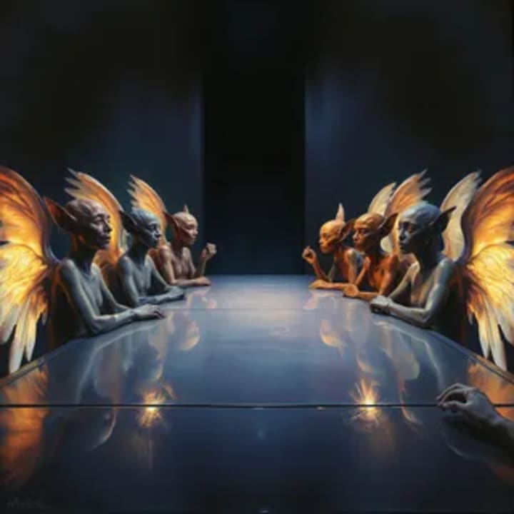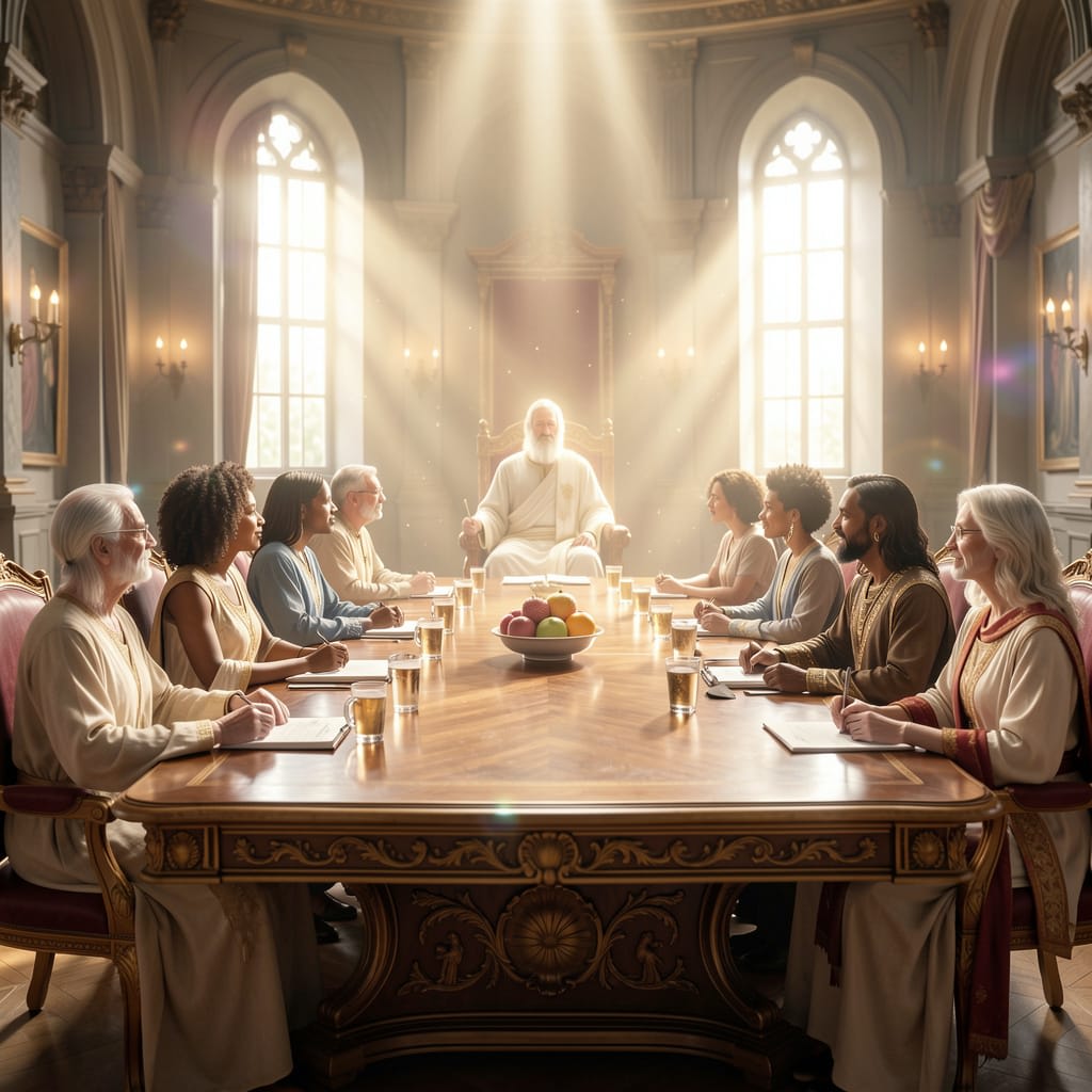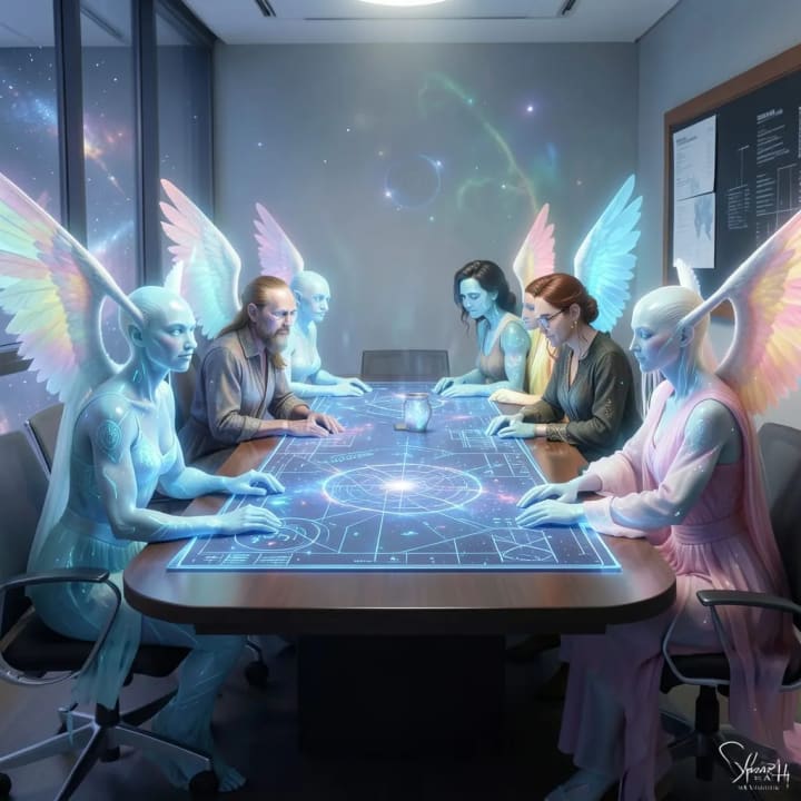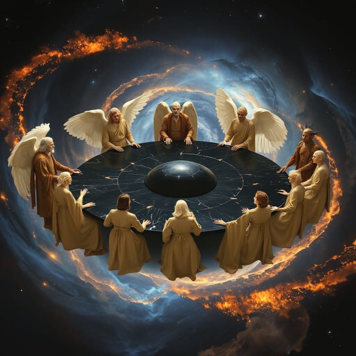 The summons goes out long before anyone admits to hearing it. A low, metallic chime...too soft to be an alarm, too insistent to be ignored ~ it threads its way through the upper precincts of Heaven, brushing past clouds, archives, and the quiet alcoves where minor deities nap with one eye open. No one can later agree on when it began. Only that it must have, because now all of the relevant celestial representatives are all here, gathered around the vast conference table that gleams like an endless polished horizon.