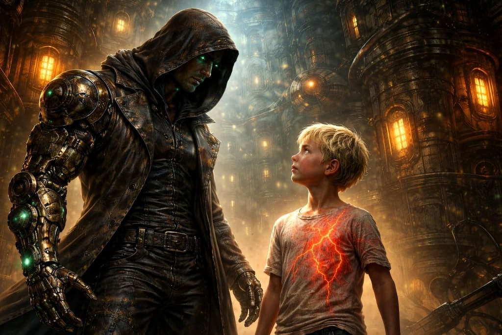 Steam escaped from his every vent as the cogs slowed down and his adrenaline faded, leaving only the burning smell of hot steel. The numbing pain returned, and dropping to his knees, Cassian-13 struggled to turn to face the boy, his veins glowing brighter, hand held out to his side, waiting for something.
