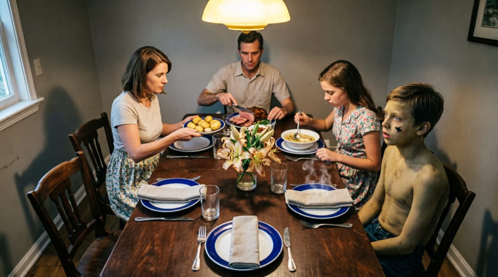 Five plates. Four breaths. One family pretending nothing is wrong.
