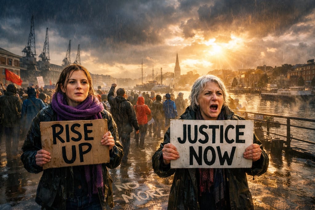 The streets of Bristol were alive that day, though not with the usual hum of buses and chatter, but with the heavy pulse of voices that demanded to be heard. I had not intended to join the protest—I came to observe, to write, to bear witness—but once I stepped into the swell of people, the energy was impossible to ignore. The banners waved above heads, each one a story, a demand, a prayer. The scent of rain-soaked asphalt mixed with the faint tang of chalk from hastily scrawled messages, leaving the air electric.