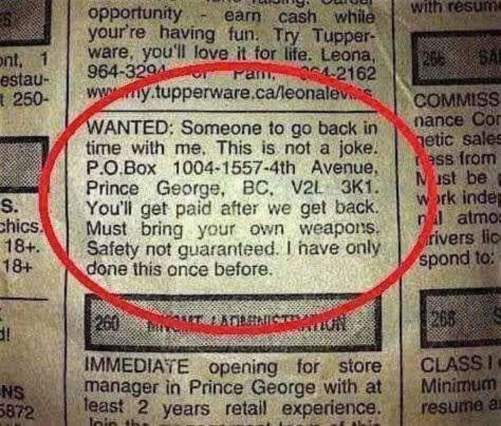"WANTED: Someone to travel back in time with me."