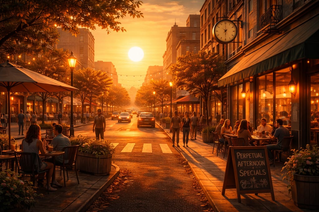 Restaurants began describing the situation as “extended golden hour,” which sounded much better than simply saying the sky had mysteriously frozen in place for no discernible reason. Patio tables filled with people enjoying long lunches that never quite transitioned into proper dinners.