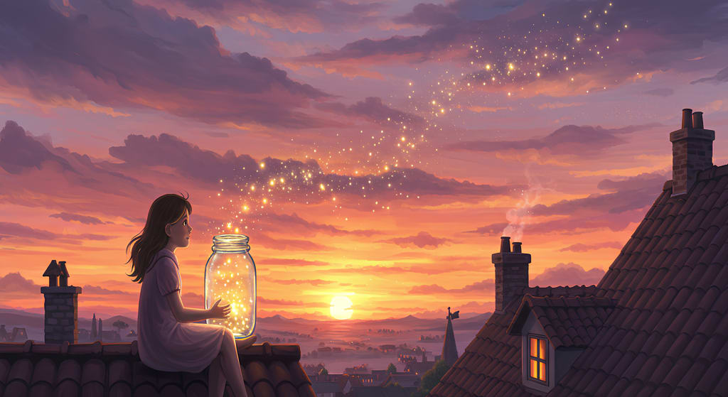 Every evening, right when the sky began to bruise into pink and gold, Mara climbed to the roof of her grandmother’s house with a glass jar in hand. She swore that if she sat quietly enough, she could catch a piece of the sunset before it slipped away.