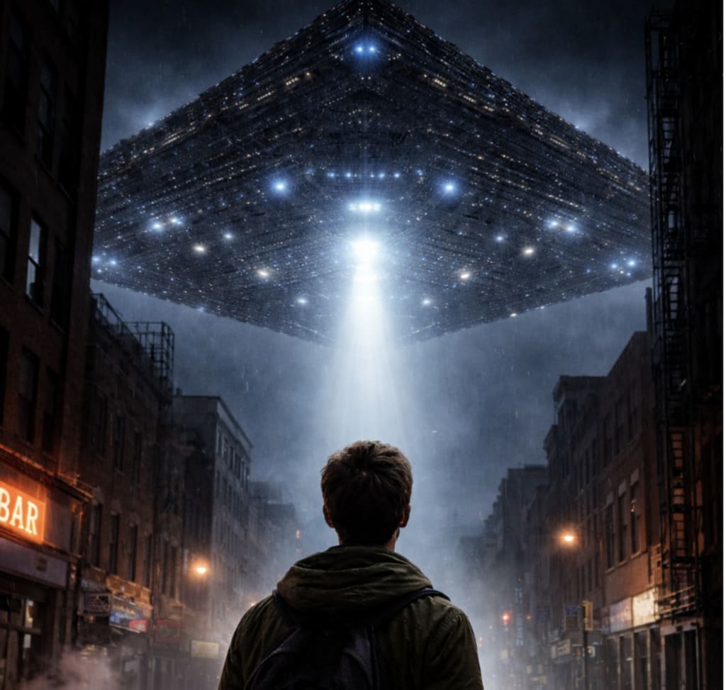 He snapped his head backwards. The sky was clearer tonight, and he could make out more details of the craft’s underside. It appeared almost organic – protrusions and craters covering the vast bulk.