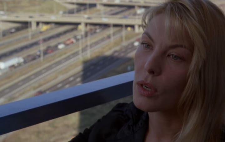 Everything is permitted as a shockier high, or buzz, to break the zombified boredom of affluent, Godless (in the Nietzschean sense of the term) modern life. Ballard and wife seek fulfillment—spiritual, physical, psychological satiation—in endless sexual trysts and conquests. Below them, the ever-present crawl of traffic is like the constant energy or lifeblood of a concrete world—a colony civilization when viewed from the balcony of their posh apartment. Unger lifts her skirt, revealing herself slowly; her voice is detached, the manner a flat affect of narcissistic boredom. Ballard seems desperate, a man trapped in a hell of non-beingness or lack of actualization. Is the world around him sensation that simply plays or fails to excite his jaded nervous system?