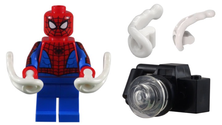 To help Spider-Man fight Venom and get the stolen treasure back, he is armed with two white power plast piece to represent him shooting web ball at his enemy. To help Peter Parker pay the rent, he brought along his trusty camera. To make sure he gets a good close-up of the action as his camera is webbed to a nearby wall, you can see the zoom lens sticking out the front of the camera. I understand that they used the 1X1 round plate with open stud because that piece is used with the Venom symbiote built, but I don’t know why they used a translucent plate for the lens. A tile piece is better for the smooth glass surface of the camera lens.