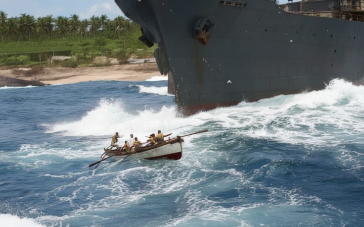 They waited for a suitable swell of the tide but never the less, fell short and crashed onto the reef. Twice they were swept out to sea swirling around and around but eventually, on a third try, they crashed high up on the reef where they perched with the ocean receding beneath them. At this point, the Banaban* captain said, "Now docket (as they called him), jump and run for your life across the reef". As he ran he looked back and saw the boat smashed to smithereens, the native crew all in the water, they were in no danger, they were such fine swimmers.