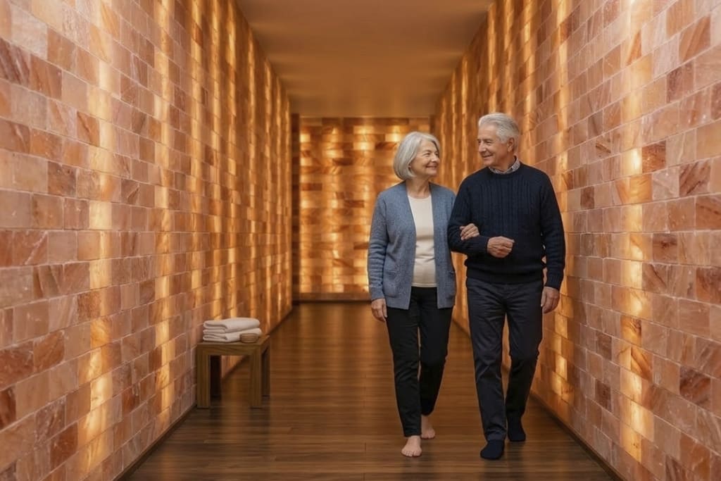 Residential Wellness Rooms: Homeowners across the U.S. are converting spare bedrooms and basement spaces into personal salt therapy rooms. A single backlit wall of Himalayan pink salt tiles can transform an ordinary room into a serene escape — ideal for seniors who prefer at-home wellness solutions.