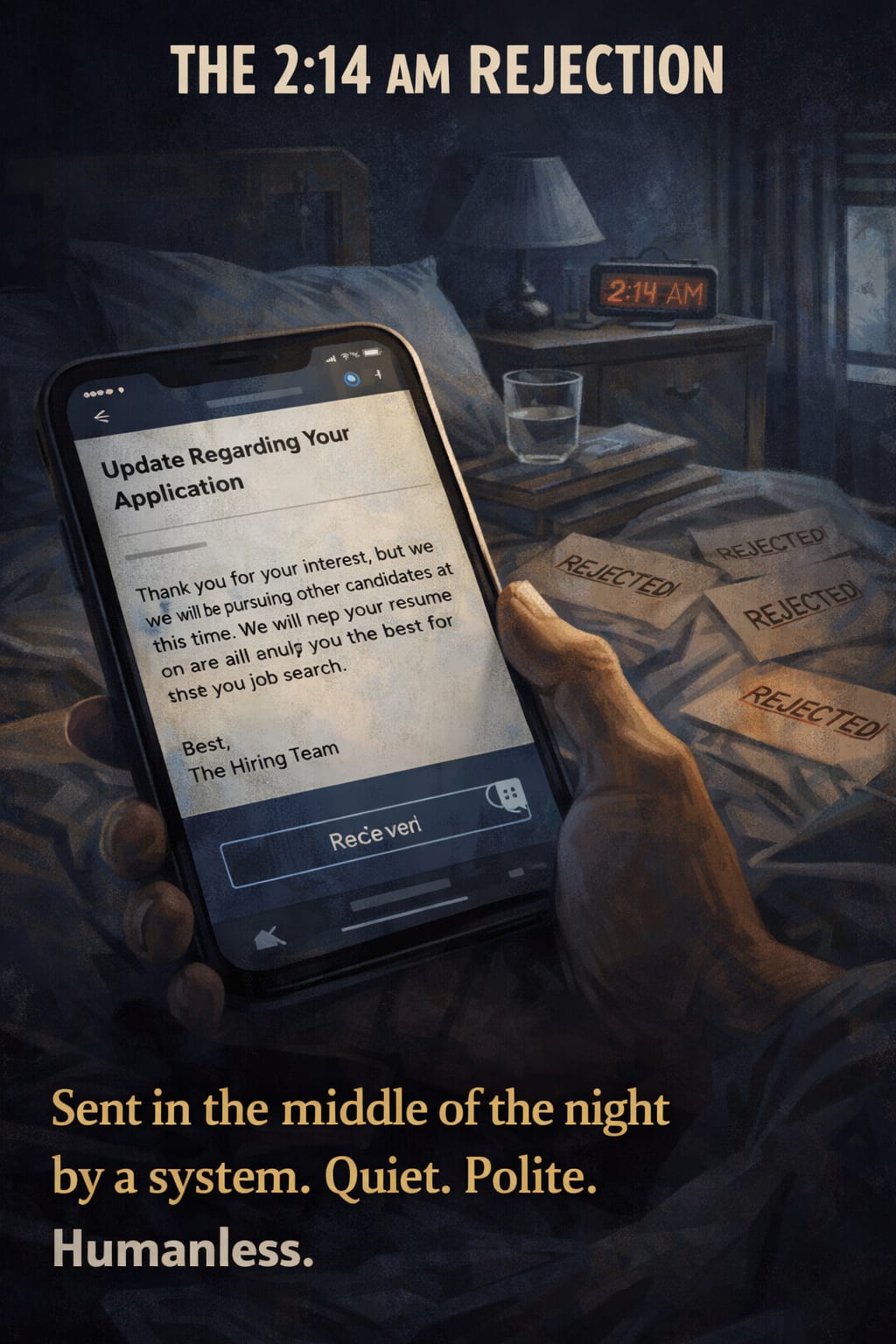 No one wrote this. No human being sat down at a keyboard at 2:14 AM and typed out my name to tell me I wasn't good enough. A template did this. A trigger in a database did this. Somewhere, a recruiter marked a box that said Reject All, and the system fired off hundreds of these emails in a burst of digital silence.