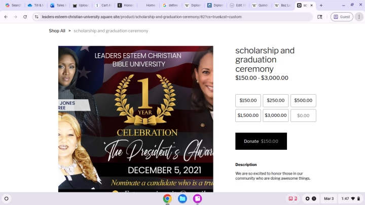 This supposed Christian university was founded in 2020 (pandemic era), that offer certificate programs, as well as, degree programs at the Associate’s, Bachelor’s, Master’s, and Doctorate levels. However, last time that I checked which I had mentioned in the TSR Investigates, that the websites had a ".net" and had other websites. It wouldn't let see the academic programs, it showed pictures of celebs dressed in PhD graduation attire , no faculty, no however there was a donation page to donate between $150.00-$3,000.