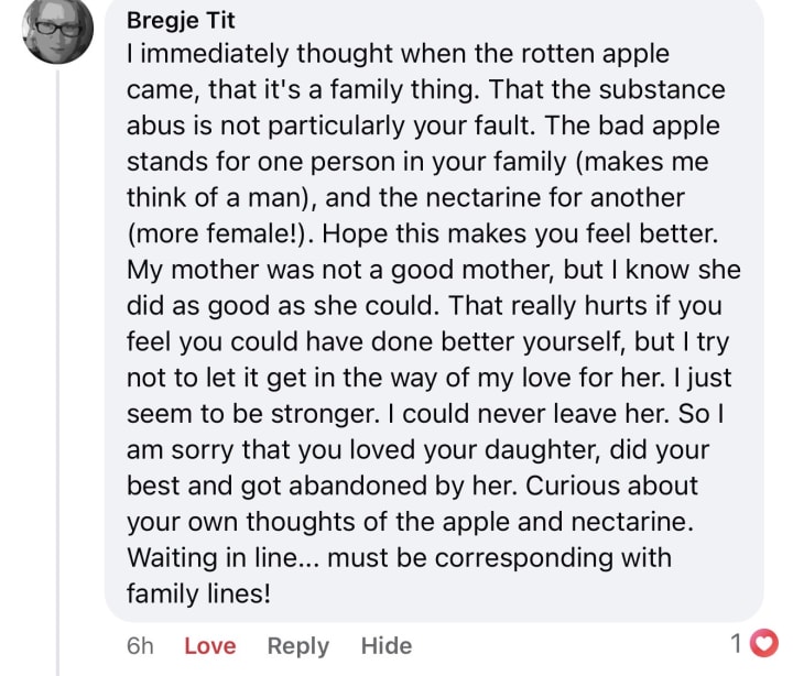 The old woman beside me says “is that yours? Rotten fruit? Why would you buy rotten fruit?” I think of my mother’s favourite saying “the apple does not fall far from the tree”. Everything is decaying, rotting. No love left for me.