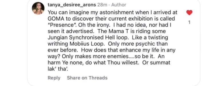 I saw my daughter on arrival, (awkward!) I didn’t think she worked Friday’s. Watching her look of animosity and horror, was gut wrenching…but I am used to being ghosted by family members of origin. So the “what the fuckery” was par for the course, I am afraid…actually NOT AFRAID. So I went to the exhibition and enjoyed what I could of it .