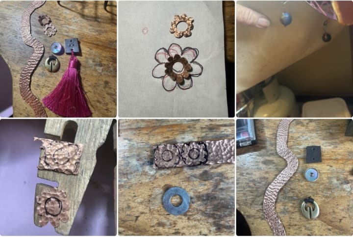 Making copper embellishments for my wooden grimoire. Also wired cages for glass marbles to use as weights for my leather catcher.