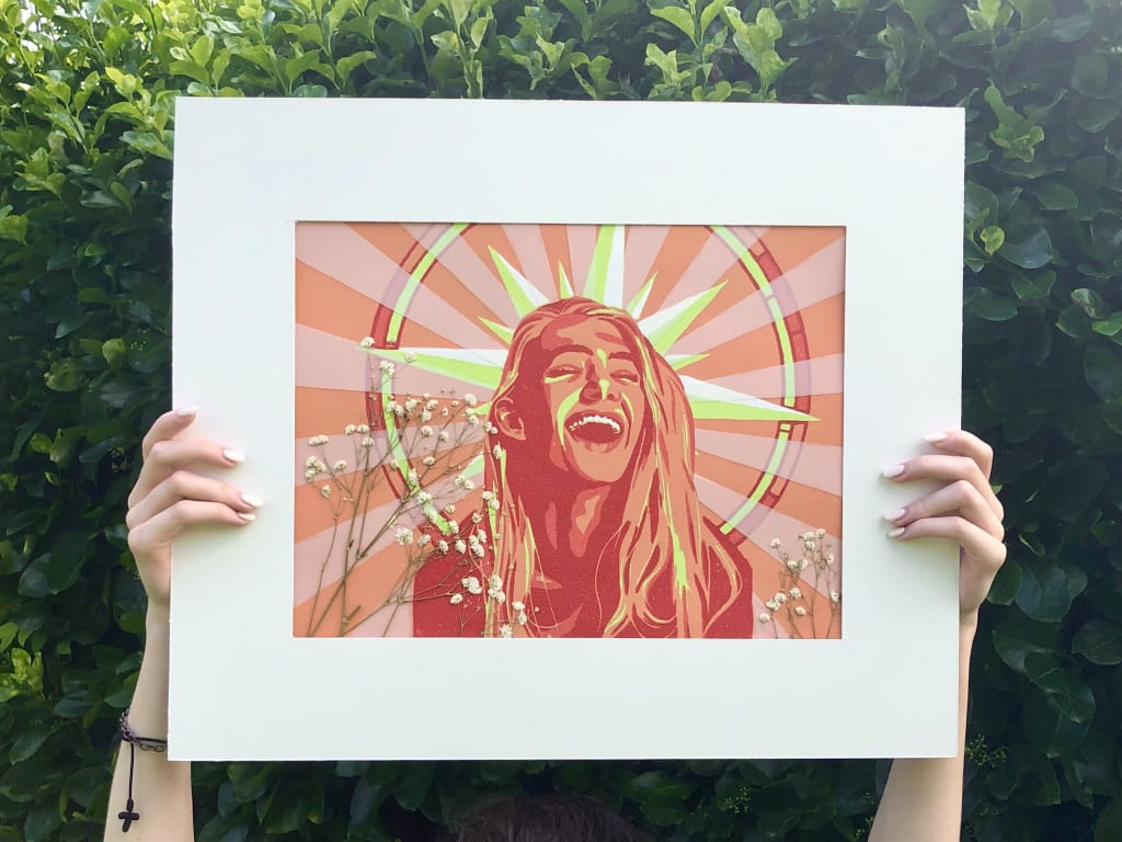 More than anything, I’m inspired by hope. Hope for a future in which everything is perfect, in which joy reigns and darkness trembles, in which people are freed from the shackles of everything they think they should be and are able to live fearlessly true to themselves, like children. This was the inspiration as I started the print. A woman, enlivened by the light of a true sun, permeated with a radical joy which no one can take from her. Far from this wearied world, where people are brokenhearted, enslaved, and desperately longing for something more. And the meaning behind the work would have stopped there, had I thought that completing the executive checklist was enough or considered giving in to the traditional pressure to keep it a single medium.