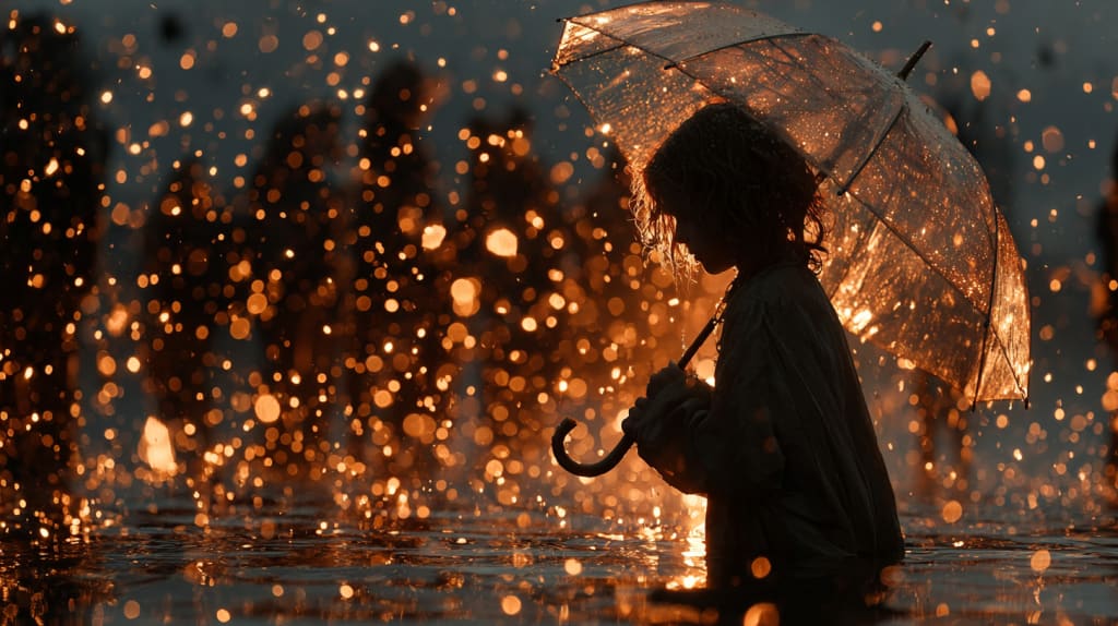 Not because the rain falls, but because I stand in it, holding this umbrella like a shield against nothing.