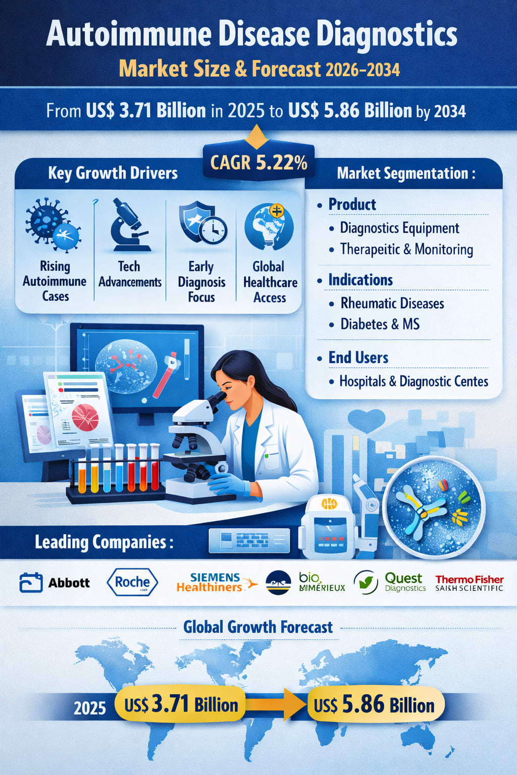 According to Renub Research, the global autoimmune disease diagnostics market is projected to grow from US$ 3.71 Billion in 2025 to US$ 5.86 Billion by 2034, registering a Compound Annual Growth Rate (CAGR) of 5.22% during 2026–2034. This consistent growth reflects the increasing complexity of autoimmune disorders and the urgent need for accurate, timely, and personalized diagnostic solutions worldwide.