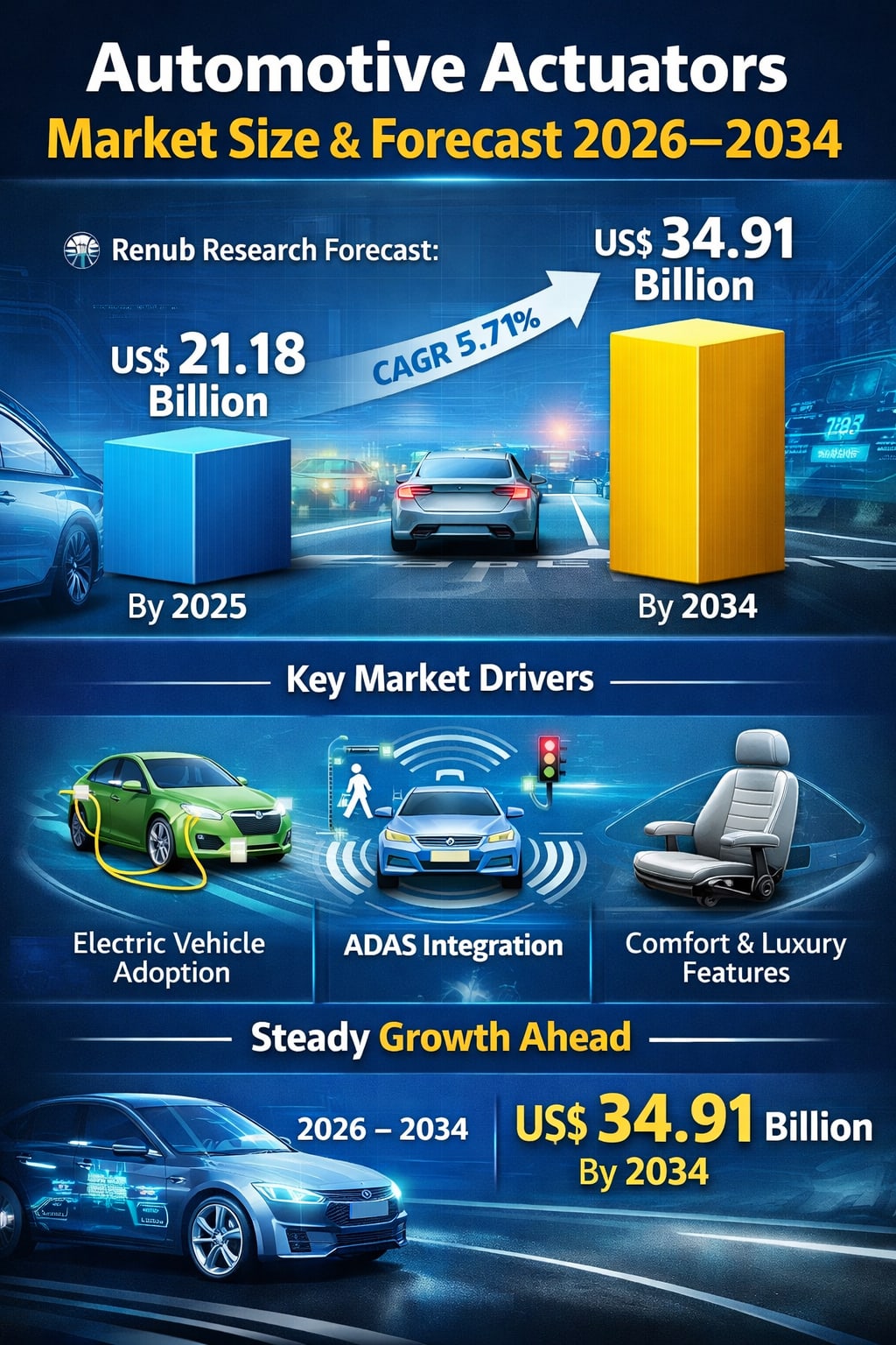 The global automotive industry is rapidly transforming as vehicles become increasingly electrified, connected, and automated. Within this evolving ecosystem, automotive actuators play a crucial role in enabling modern vehicle functions. According to Renub Research, the global Automotive Actuators Market is expected to grow from US$ 21.18 Billion in 2025 to US$ 34.91 Billion by 2034, expanding at a compound annual growth rate (CAGR) of 5.71% between 2026 and 2034.