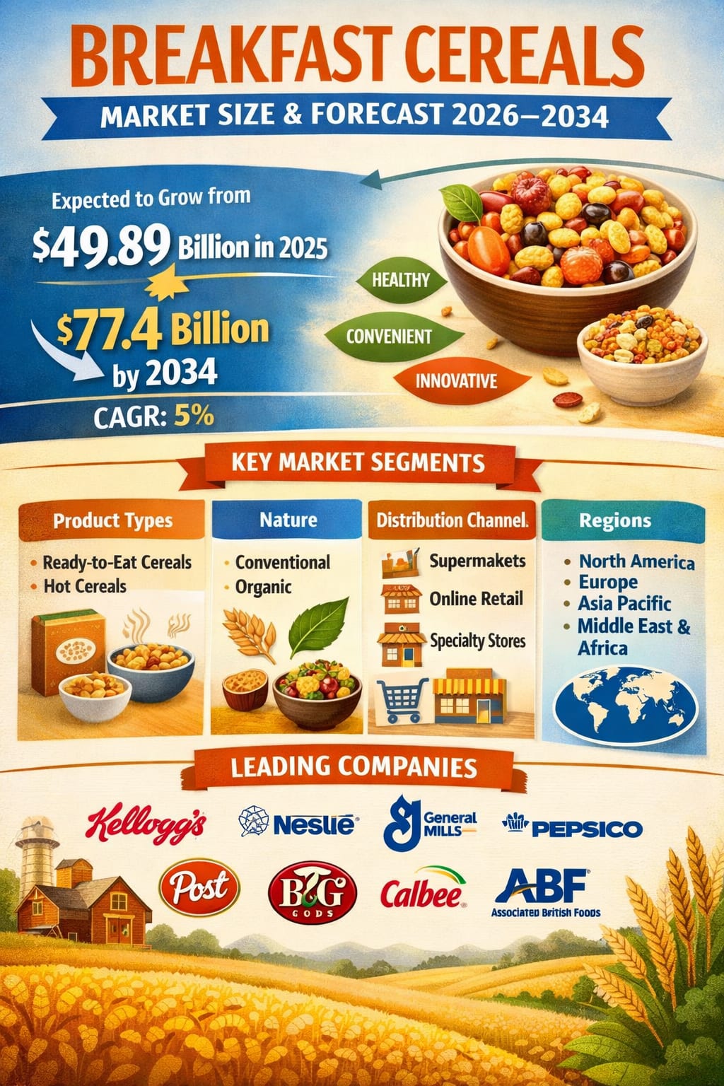 The global breakfast cereals market is entering a new phase of sustained growth, driven by evolving consumer lifestyles, health awareness, and innovation across product categories. According to Renub Research, the Breakfast Cereals Market is expected to reach US$ 77.4 billion by 2034, rising from US$ 49.89 billion in 2025, expanding at a CAGR of 5% from 2026 to 2034.