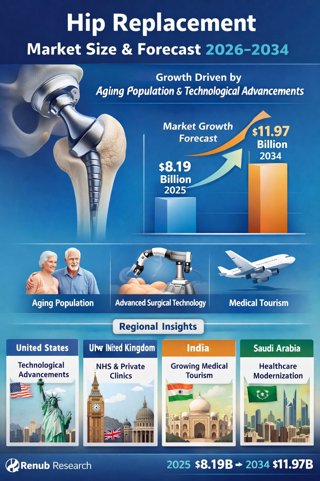 The global Hip Replacement Market is entering a decade of stable and meaningful expansion, supported by demographic shifts, technological progress, and improved healthcare accessibility. According to Renub Research, the market was valued at US$ 8.19 billion in 2025 and is projected to reach US$ 11.97 billion by 2034, growing at a steady Compound Annual Growth Rate (CAGR) of 4.31% from 2026 to 2034.