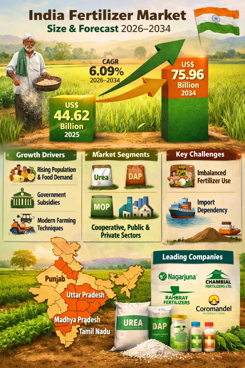 The India fertilizer market is poised for steady and sustainable growth over the next decade, driven by the country’s rising population, increasing food consumption, and the urgent need to enhance agricultural productivity. According to Renub Research, the market is projected to grow from US$ 44.62 Billion in 2025 to US$ 75.96 Billion by 2034, expanding at a Compound Annual Growth Rate (CAGR) of 6.09% during 2026–2034.