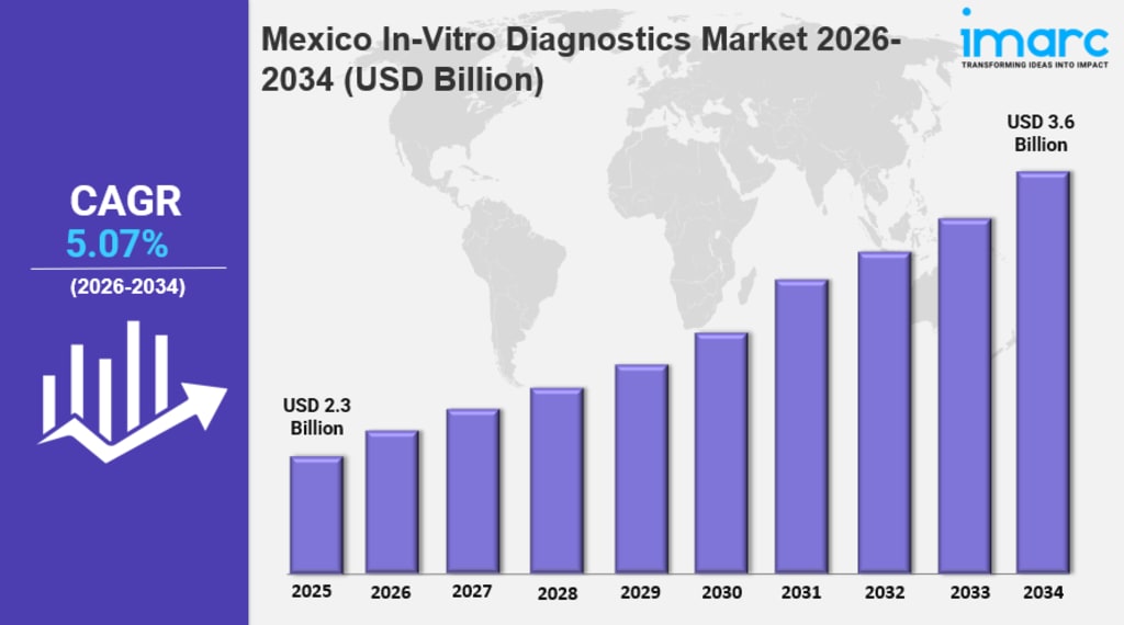 Mexico In-Vitro Diagnostics Market reached USD 2.3 Billion in 2025 and is projected to reach USD 3.6 Billion by 2034, growing at a CAGR of 5.07% during 2026–2034, driven by rising chronic diseases and healthcare expansion.